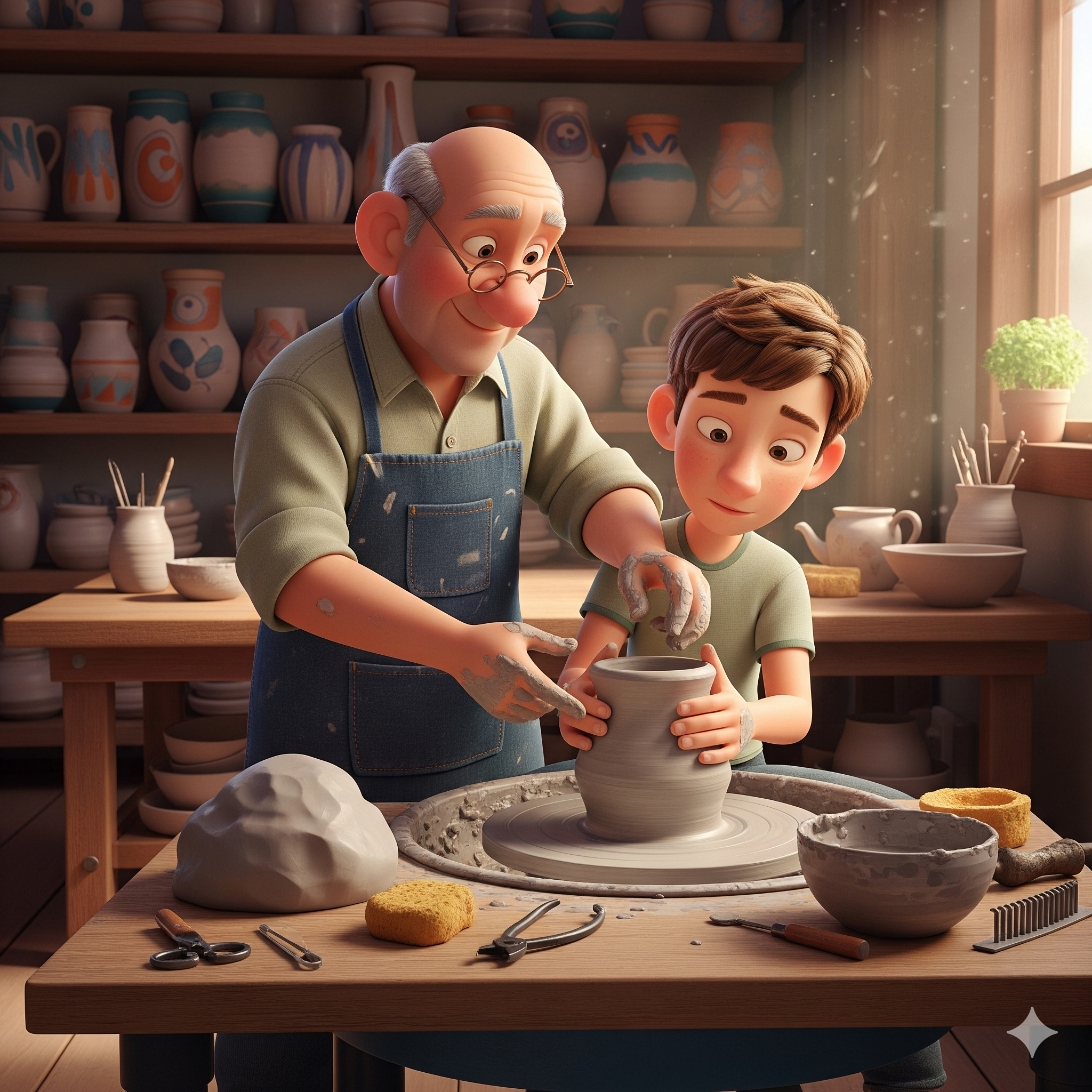 So, the young person kept trying. Day after day, he practiced. Sometimes the pots broke in the kiln. Sometimes they became misshapen or fell apart. But little by little, he learned how to knead the clay properly, center it on the wheel, and move his hands carefully. Every mistake taught him something new. Slowly, he began to understand the value of patience and the importance of knowing what steps to take—how to prepare things before starting work, and how to handle them after. Planning, careful attention, and following the right steps made the work easier and more successful.