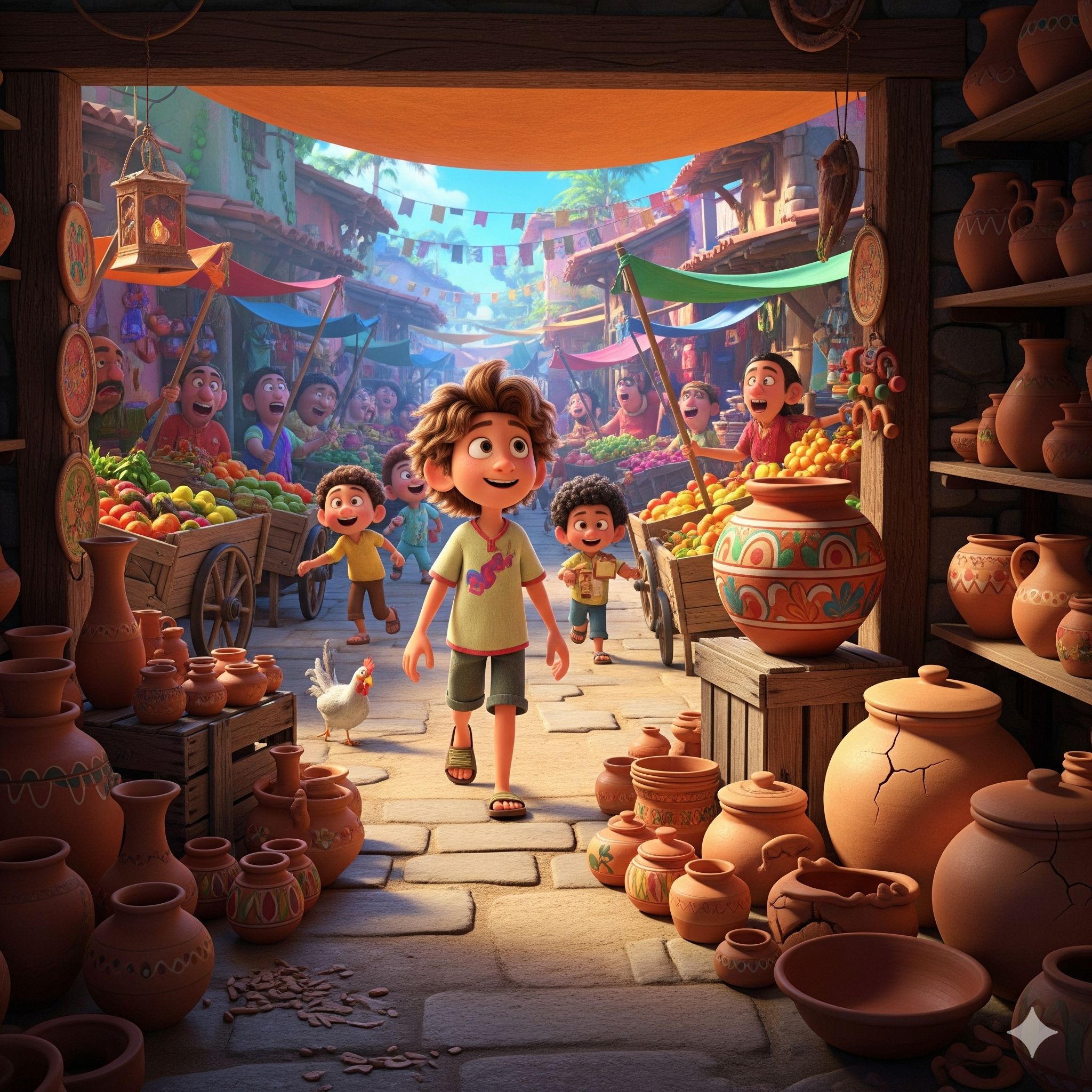 In a quiet little village, a young person walks through the market every morning. The market was alive with sounds—the clatter of carts, the calls of sellers, and the laughter of children running between stalls. Full of energy and positive vibes to walk around the market. But one shop always caught their attention. It was filled with clay pots—big, small, plain, painted, and even some that were cracked. Each pot seemed to have its own story.